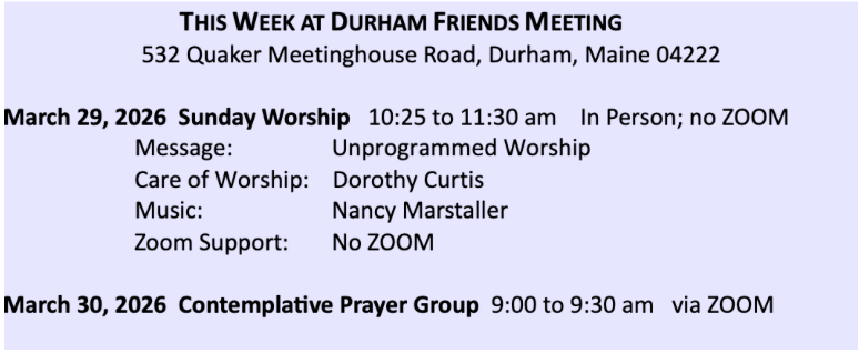 - March 29: Unprogrammed Worship
