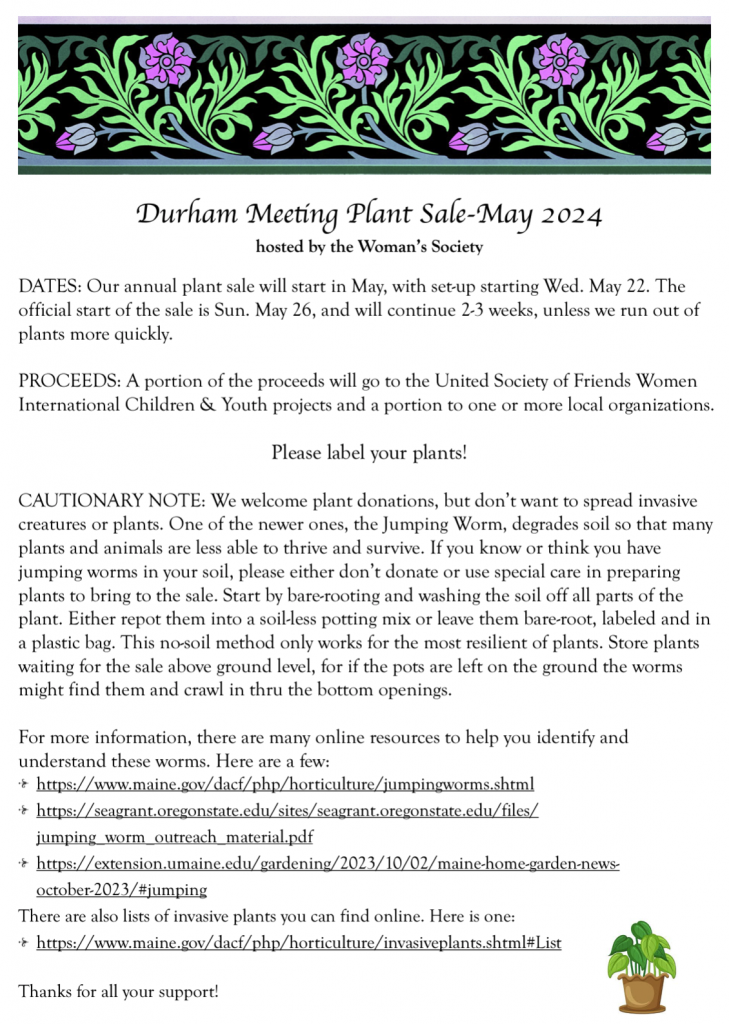Treasurer’s Report: Nancy told us that the plant sale earned $1060. One half will be given to the Good Shepherd Food bank, the rest split between USFWI fund for education of girls in Kenya and the Ramallah Friends School in Palestine.