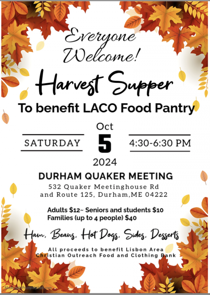 Durham is to provide desserts for this benefit dinner. As we go to print the details on this part of the plan are not yet available. Listen for announcements at Meeting or contact Margaret Wentworth or Daphne Clement for more information.