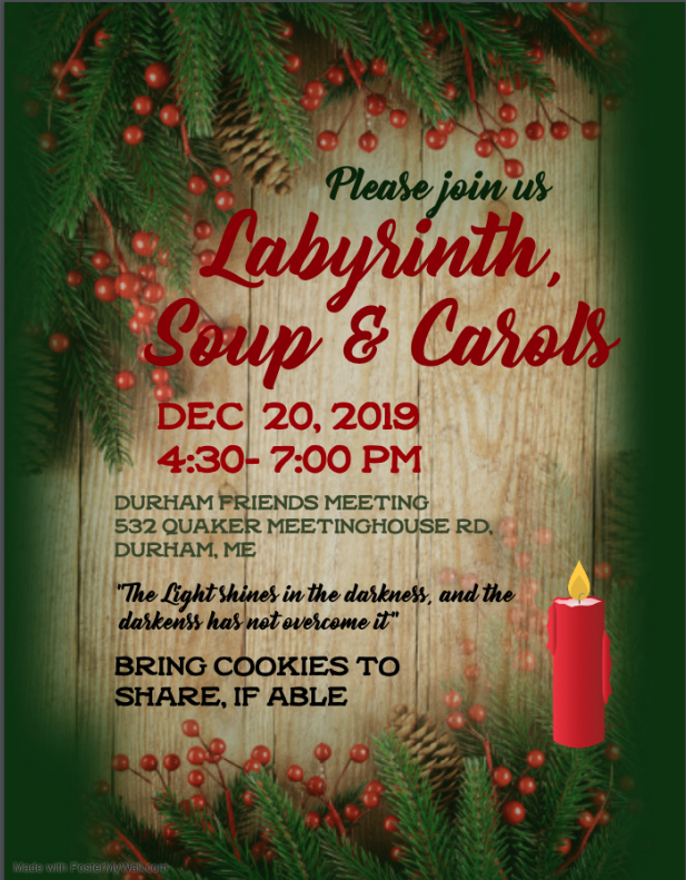 Labyrinth, Soup & Carols, December 20, 4:30 to 7:00 pm Posted on December 12, 2019 by Doug Please follow and like us: Share this: Click to print (Opens in new window) Print Click to share on Facebook (Opens in new window) Facebook