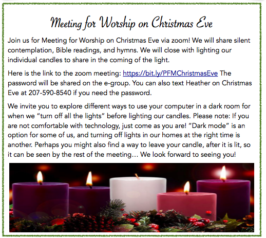 Christmas Eve Worship, Portland Friends Meeting (via Zoom), 5pm Posted on December 21, 2020 by Doug Please follow and like us: Share this: Click to print (Opens in new window) Print Click to share on Facebook (Opens in new window) Facebook