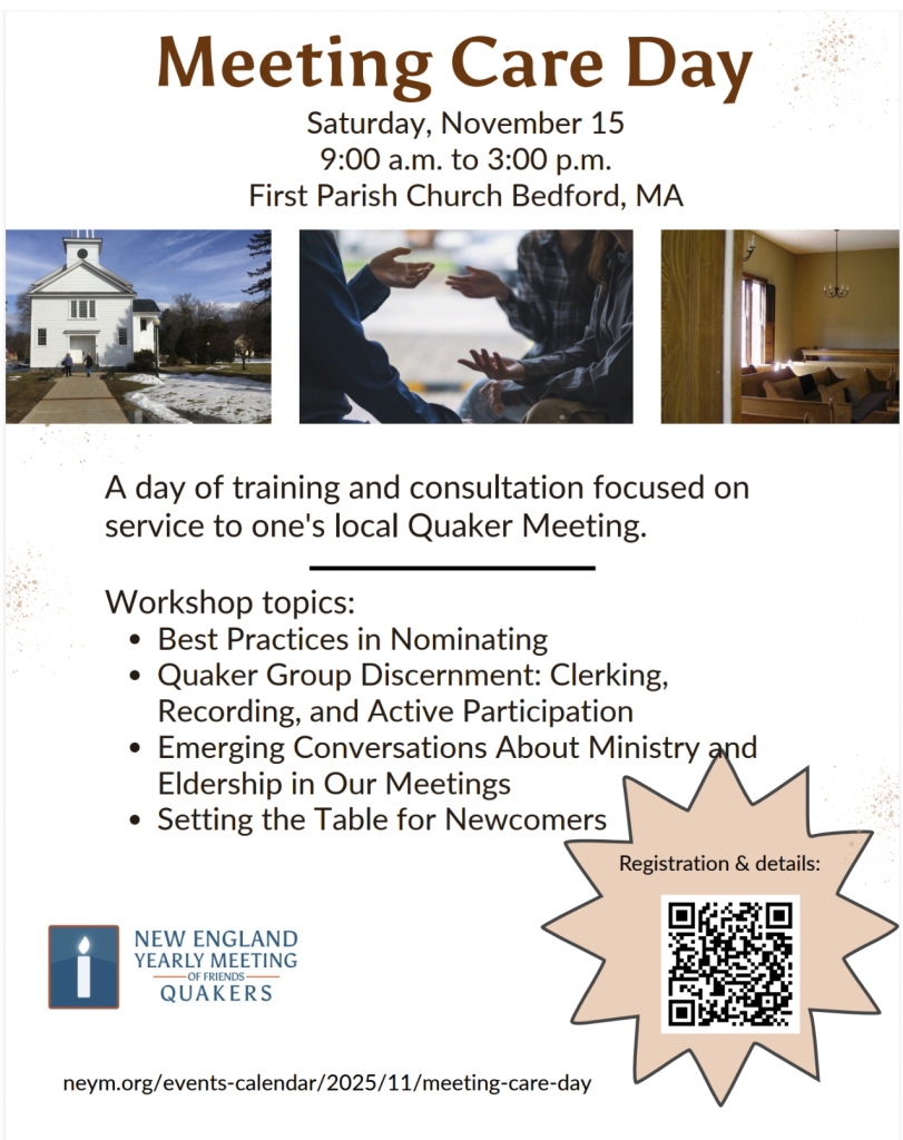 Do you serve your local Quaker meeting? Are you looking to connect with others serving in similar roles to discuss challenges and explore best practices? Join us for Meeting Care Day, an in-person event featuring multiple workshop options related to specific service areas. Before and after the morning and afternoon workshop sessions, we will gather for worship and fellowship, making for an energizing day.
