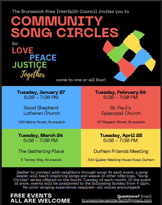 The Brunswick Area Interfaith Council (BAIC) invites all to join them at the next Community Song Circle for Love, Peace, Justice, Together, Tues, April 28, 6:30-7:30pm, Durham Friends Meeting, 534 Quaker Meeting House Road, Durham, ME.k Area Interfaith Council will hold its monthly song circle on Tuesday, April 28, at Durham Friends Meeting, 6:30 to 7:30 pm.